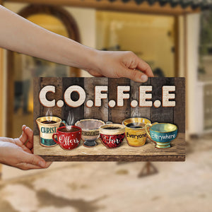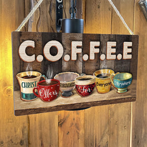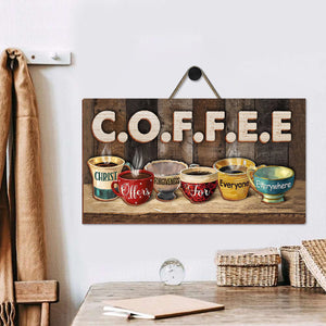 Elevate the warmth of your home with this beautiful Personalized C.O.F.F.E.E. Wooden Sign, designed to bring both your love for coffee and your faith into a single, heartwarming piece of decor. This rustic sign creatively spells out "C.O.F.F.E.E" with each letter represented by a different, uniquely styled coffee cup, each adorned with a special word that together form a powerful message: