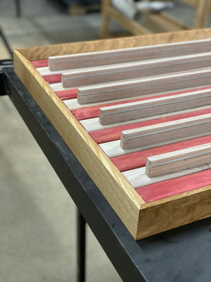 Challenge coin rack made from solid red oak and reclaimed pine, capable of holding dozens of your favorite military challenge coins as well as a 3 x 5 photo. Mounts easily to the wall or can stand upright for easy display. If interested in custom dimensions please reach out for additional details.