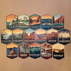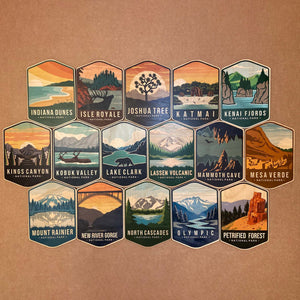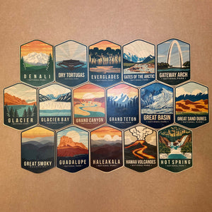 Acadia National Park, Arches National Park, Badlands National Park, Big Bend National Park, Bryce Canyon National Park, Crater Lake National Park, Death Valley National Park, Denali National Park, Everglades National Park, Glacier National Park, Grand Canyon National Park, Grand Teton National Park, Great Smoky Mountains National Park, Joshua Tree National Park, Mammoth Cave National Park, Mount Rainier National Park, Olympic National Park, Petrified Forest National Park, Rocky Mountain National Park, Sequoia National Park, Voyageurs National Park, Yellowstone National Park, Yosemite National Park, Zion National Park