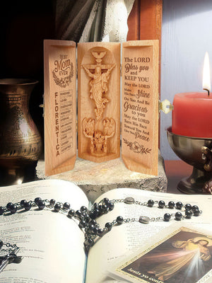 This intricately crafted wooden sculpture is a heartfelt tribute to faith and family. The product features a beautifully designed cylindrical wooden container that opens to reveal a 3D depiction of Jesus Christ on the cross, surrounded by angels and a dove symbolizing the Holy Spirit.
