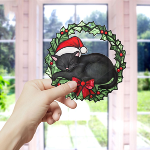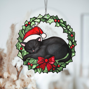 Black Cat Christmas Ornament, Christmas Cat Suncatcher Ornament, Christmas Wreath Ornament