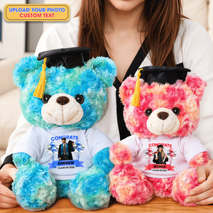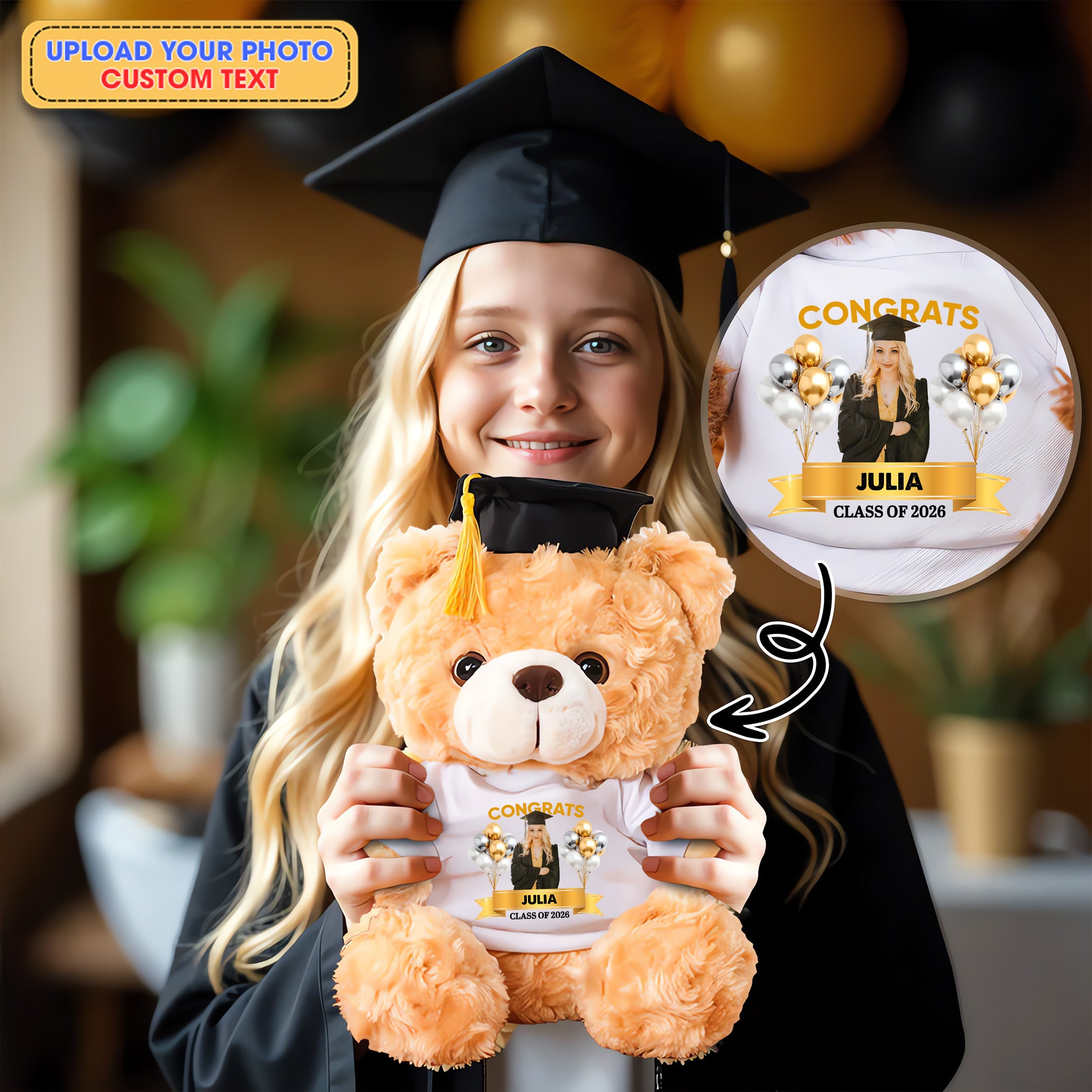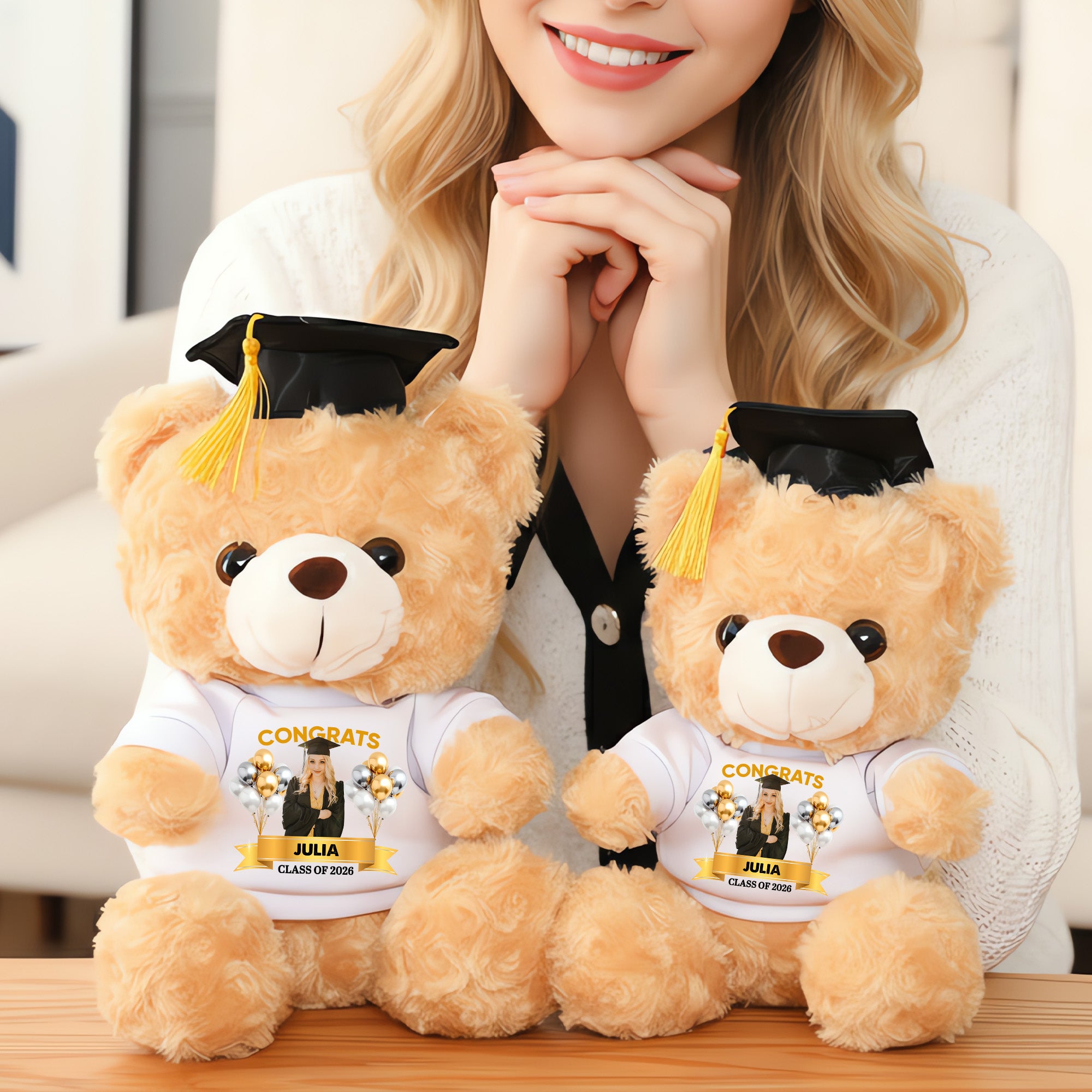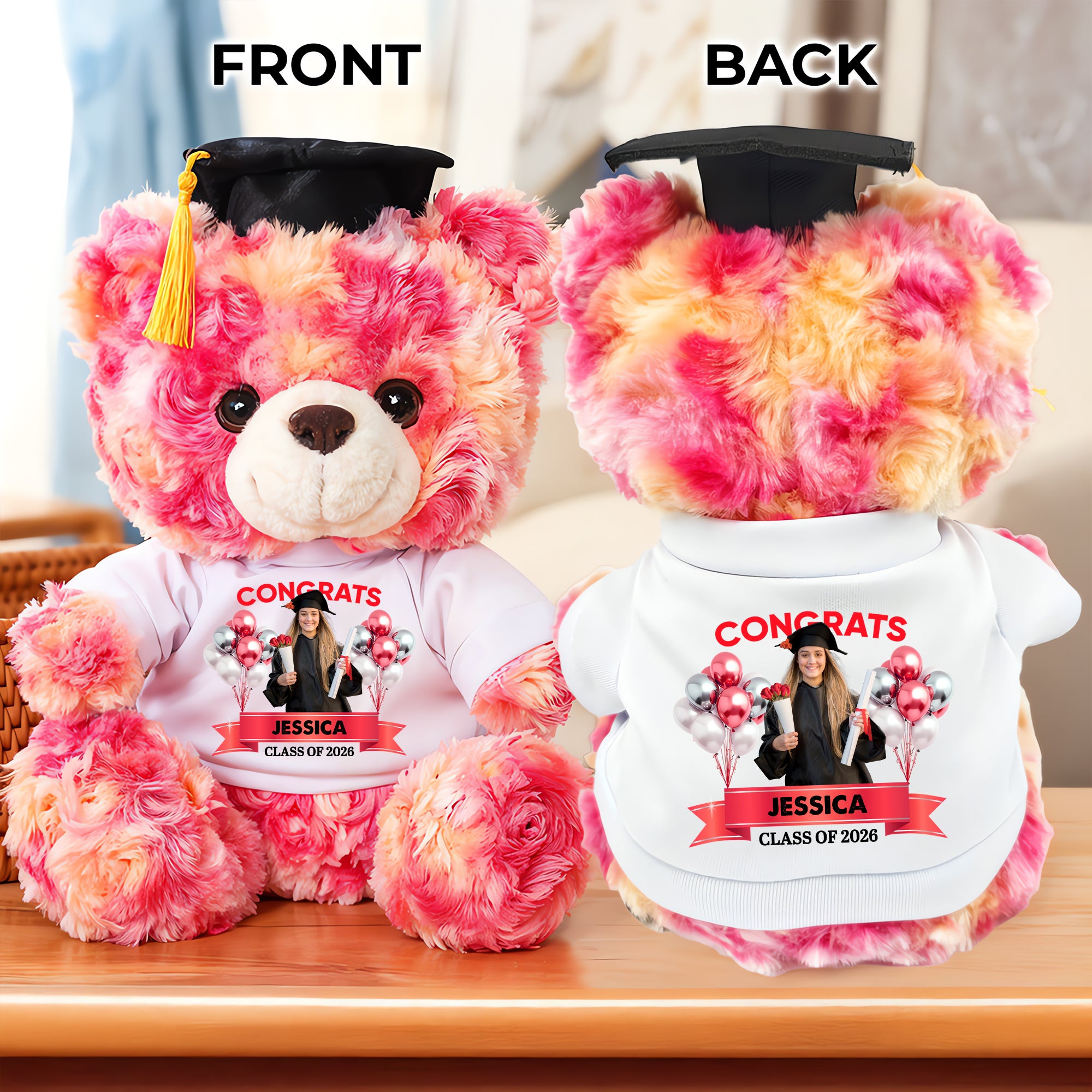 With its plush softness and personalized T-shirt, this bear is more than just a toy, it is a cherished keepsake full of sentiment. The custom graduation bear features a classic graduation cap, symbolizing achievement and success. The customizable T-shirt allows you to add a name, photo, or school name, making it a personalized graduation teddy bear that offers heartfelt encouragement and celebrates the graduate’s journey.