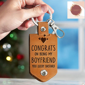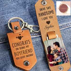 Congrats On Being My Boyfriend Personalized Photo Leather Keychain, Gift for Couple