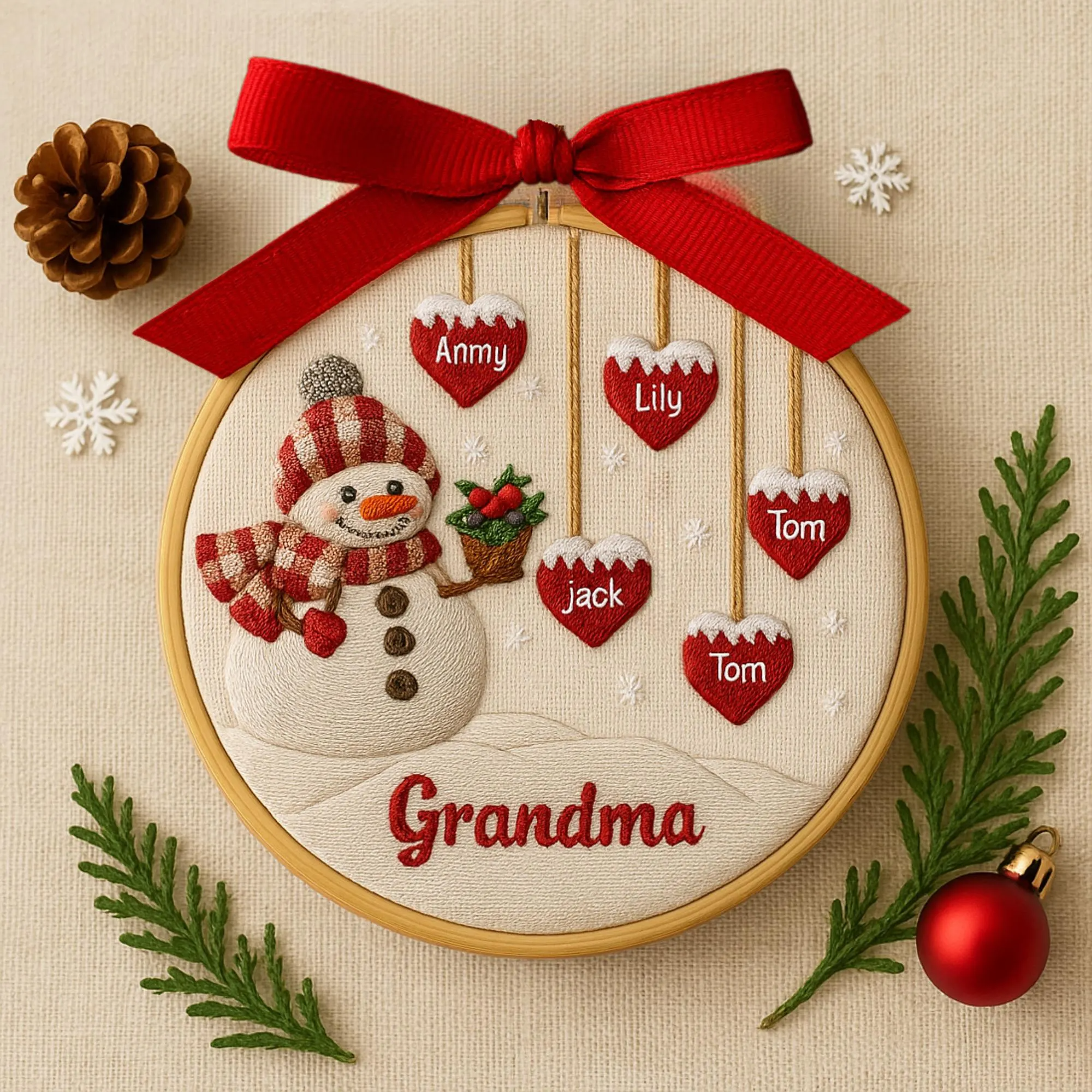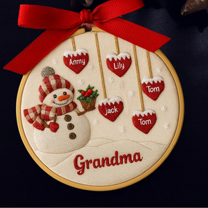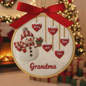 Custom Family Name Grandma Snowman Embroidery Hoop Ornament, Embroidered Christmas Ornament, Gift For Grandma