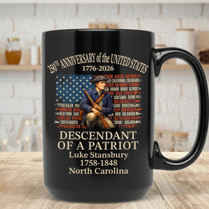 Custom Name Descendant of a Patriot Black Mug, Personalized 250 Years USA 1776–2026 Coffee Mug