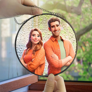 Custom Photo Cartoon Portrait Couple Stained Glass Suncatcher, Valentine Gift For Couple