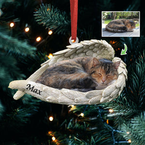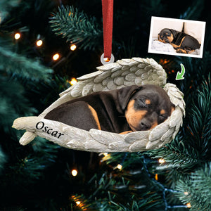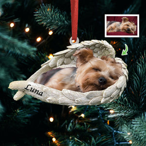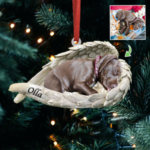 Customized Pet Themed Ornament: Cherish the memory of your beloved pet with our Personalized Dog Photo Acrylic Ornament, featuring a serene depiction of a sleeping pet cradled within angel wings. This touching ornament allows you to upload a photo of your dog, making it a deeply personal keepsake that celebrates the bond you shared.