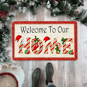 The mat features a charming holiday-themed design, showcasing traditional Christmas elements like Santa hats, candy canes, holly berries, and snowflakes woven into the word "HOME." This unique, inviting design welcomes everyone to your home in a joyful and festive way.