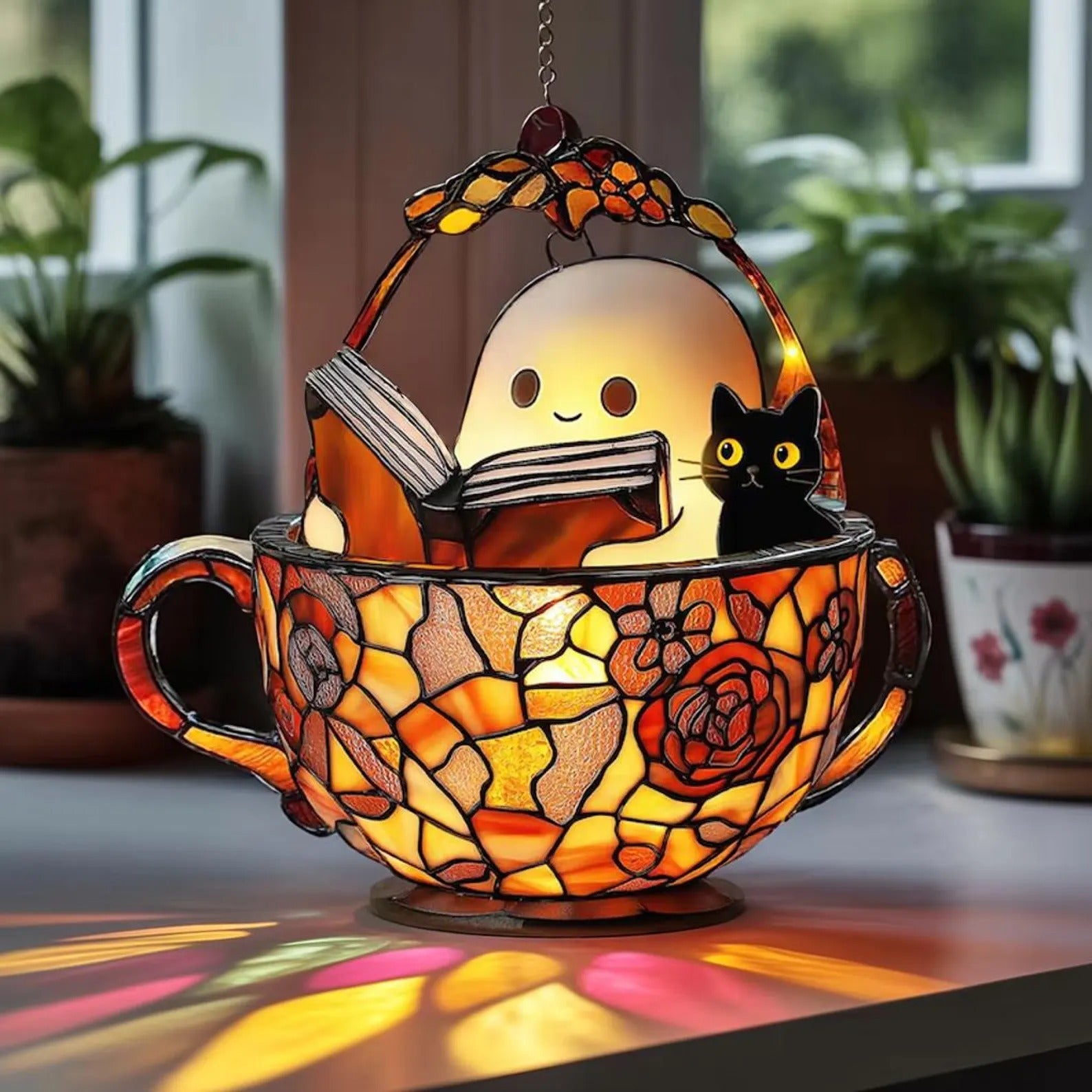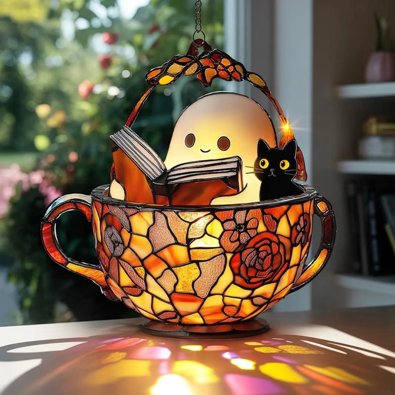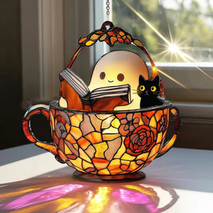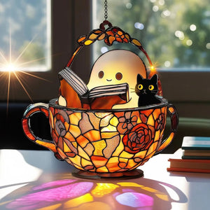 Ghost And Black Cat In Teacup, Book Lover Gift, Acrylic Suncatcher, Christmas Gifts, Christmas Ornament