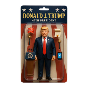 ✔ Classic toy box style design, recreating the image of Donald Trump with iconic accessories such as MAGA hat, microphone, podium and speech.