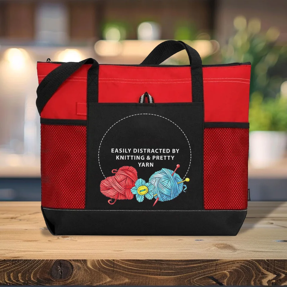 The tote features a delightful design with the quote "Easily Distracted By Knitting & Pretty Yarn" capturing the spirit of yarn lovers everywhere. The bag also includes multiple pockets and compartments to keep your supplies organized and easily accessible.