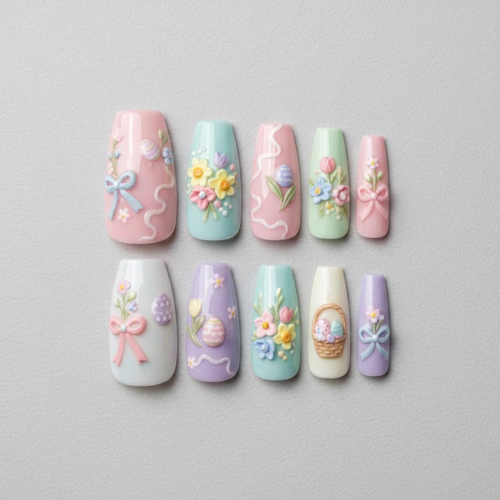 Easter Spring Garden Press On Nails, 3D Bunny Egg Floral Nails, Easter Day Nails