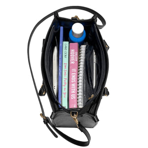 The bag features two handles, a detachable shoulder strap, and a zippered closure. It can be worn as a handbag, shoulder bag, or crossbody bag.