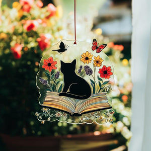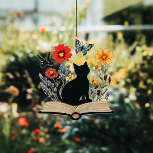Floral Cat Lying On Book Acrylic Ornament, Library Wall Decor, Gift For Cat Lovers
