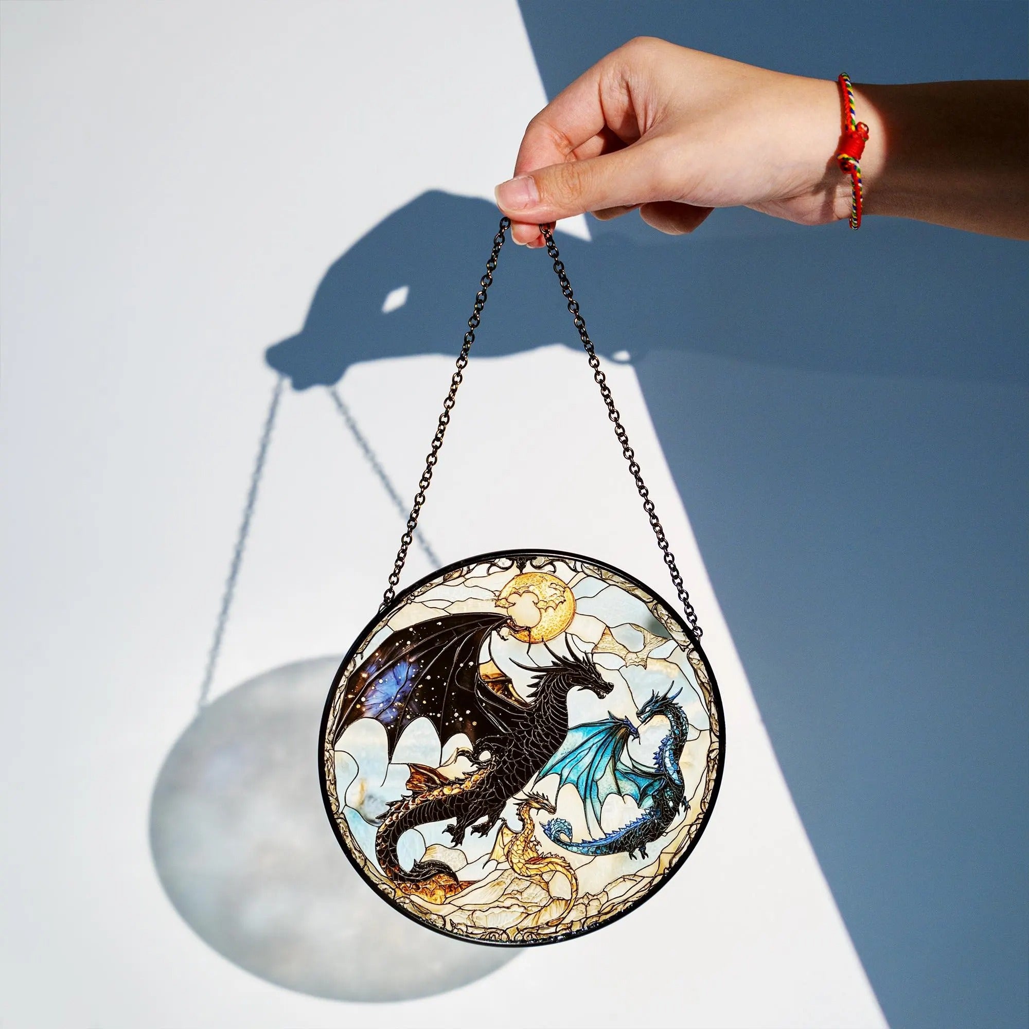 Material: Made with premium stained glass. Our stained glass version is a true work of art, meticulously handcrafted with vibrant, jewel-toned glass that reflects sunlight to create a dazzling display of colors. Each piece is carefully selected to evoke a sense of timeless beauty, making it a statement piece in any room. When sunlight passes through the glass, it transforms your space into a kaleidoscope of hues, filling your room with warmth and color.