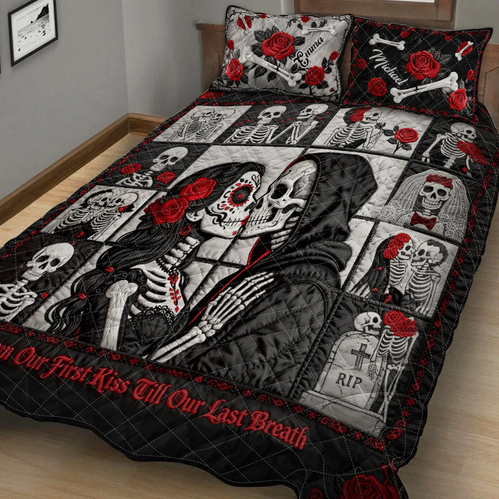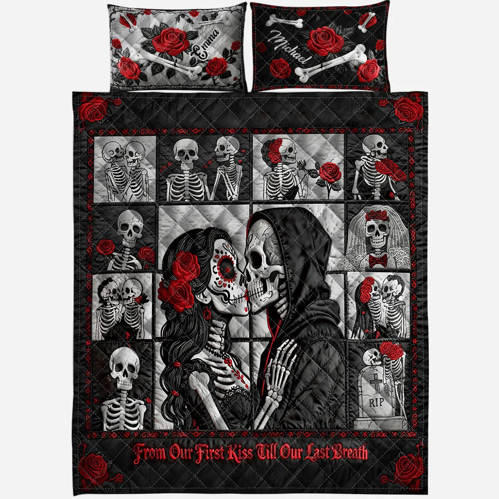 From Our First Kiss Till Our Last Breath Skull And Roses Couple Bedding Set, Cool Valentine Gift