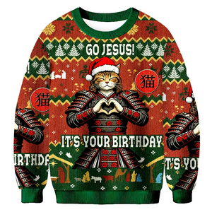 Go Jesus It's Your Birthday Samurai Cat Ugly Sweater, Funny Christmas Ugly Sweatshirt, Xmas Ugly Sweater