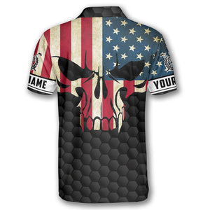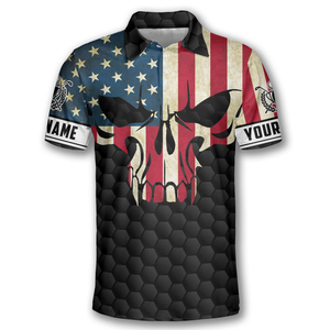 Golf Skull American Flag Custom Golf Polo Shirts for Men, Long Sleeve Golf Shirts, Golf Lovers Gift
