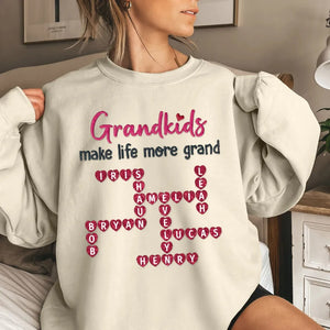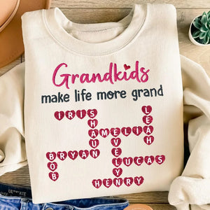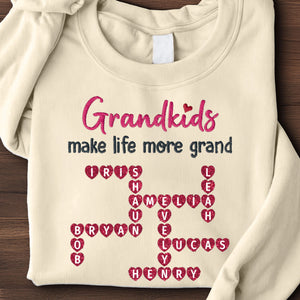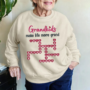 Grandkids Make Life More Grand Crossword Puzzle Art Personalized Glitter Embroidery Sweatshirt, Gift For Grandma