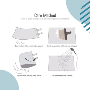 Take your rug outside and shake off any loose dirt, direct sunlight will cause the color of your rug to fade, vacuum with a non rotary type attachment, professional cleaning is recommended , spot cleaning can be done with cold water, mild detergent is not recommended.