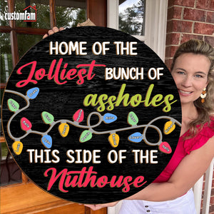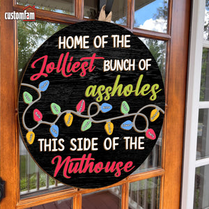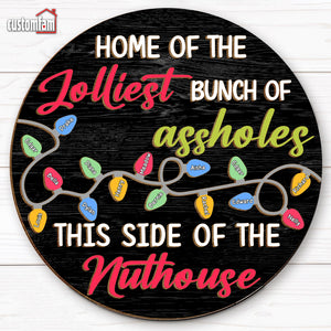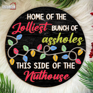 - The sign features the fun and cheerful phrase "Home Of The Jolliest Bunch," inspired by classic holiday movies and festive traditions. It captures the lighthearted nature of the holiday season, creating a cozy and welcoming atmosphere. The whimsical font and playful design elements like snowflakes, Christmas trees, or holly berries add to the festive charm.