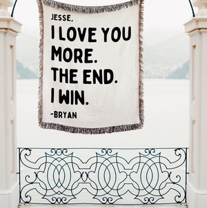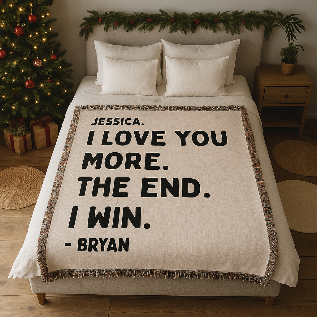 Wrap yourselves in love and laughter with our "I Love You More The End I Win Blanket". This cozy and playful blanket is the perfect way to express your love while adding a fun twist. Ideal for Valentine’s Day, anniversaries, or simply to surprise your special someone, this blanket makes a warm and heartfelt gift. With its sweet message and soft, comfy feel, it’s perfect for cuddling up together on chilly nights or as a cozy reminder of your love every day.