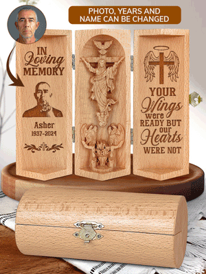 This intricately crafted wooden sculpture is a heartfelt tribute to faith and family. The product features a beautifully designed cylindrical wooden container that opens to reveal a 3D depiction of Jesus Christ on the cross, surrounded by angels and a dove symbolizing the Holy Spirit.