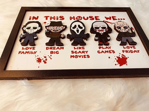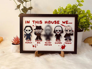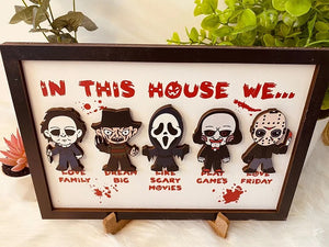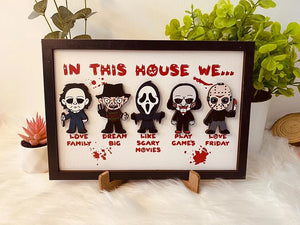 Add a touch of horror and humor to your home with our "In This House We..." custom wooden sign. Perfect for fans of classic horror movies, this sign is a unique and playful way to showcase your love for iconic characters while highlighting the values and activities your household cherishes.