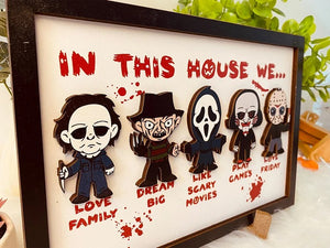 In This House We Horror 2 Layered Wooden Door Sign, Scary Movies Fan Gift, Halloween Decor