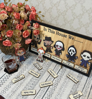 Unique Design: A two-layered frame wooden sign featuring a variety of horror-themed elements and the phrase "In This House We Horror," creating a chilling and fun atmosphere.