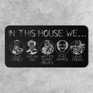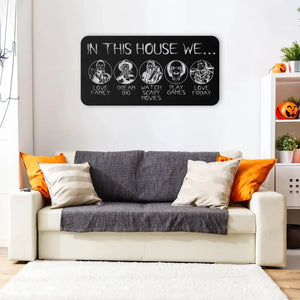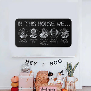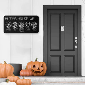 Embrace the spooky season with our "In This House We..." Halloween Metal Sign. Perfect for horror enthusiasts, this sign combines a love for family with the thrills of Halloween, making it an excellent addition to your seasonal decor.