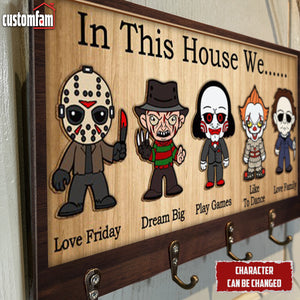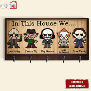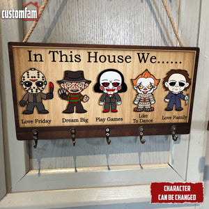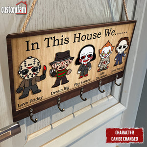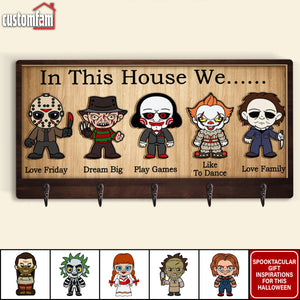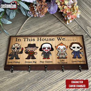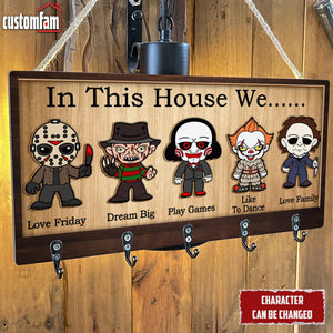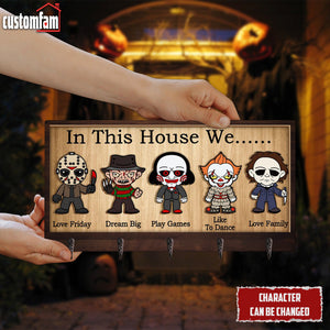 In This House We Horror Personalized Wooden Key Holder, Scary Movies Fan Gifts, Halloween Decor