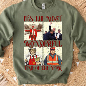 This festive sweatshirt design humorously features Donald Trump in various holiday-themed and iconic settings. At the top, the phrase "IT'S THE MOST WONDERFUL" is displayed in large, decorative red lettering, with "TIME OF THE YEAR" written below the images. This playful take on the holiday spirit combines nostalgia, humor, and a touch of political satire, making it a memorable and unique Christmas sweater.