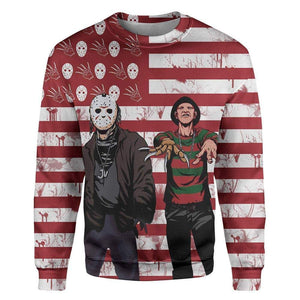 T-shirt, Sweatshirt and Hoodie of two famous characters from the horror movie Freddy and Jason. Perfect for horror movie enthusiasts and Halloween fanatics, this cozy sweatshirt makes a fantastic addition to your wardrobe.