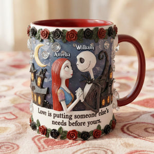 Love Is Putting Someone Else's Needs Before Yours Gothic Couple Personalized Mug, Funny Valentines Gift