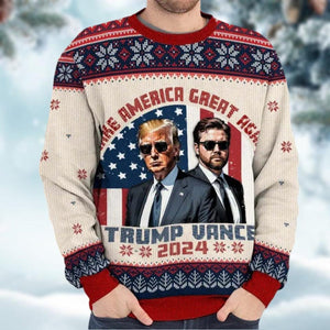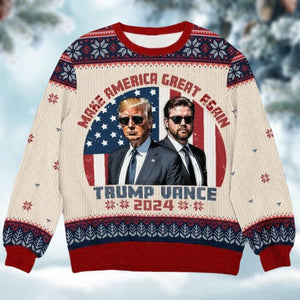 Celebrate the holiday season in style with this bold Trump Vance 2024 Christmas sweater! Featuring a patriotic design with "Make America Great Again" and iconic imagery, this funny ugly sweater is perfect for political humor lovers, Christmas parties, or as a unique holiday gift. Made from soft, durable knit fabric, it offers comfort and style for men and women alike.
