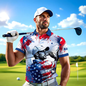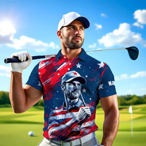 Turn heads on the course and show your patriotic pride with this Custom Face American Flag Golf Polo! Featuring a personalized portrait of your face transformed into a dynamic, illustrated golfer and surrounded by bold red, white, and blue brush strokes, this shirt is a true celebration of both personality and patriotism.