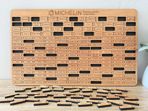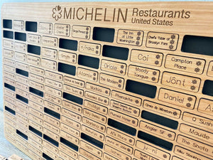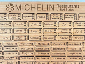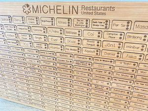The ultimate foodie bucket list is here! This Michelin Restaurants Bucket List features all 202 of the Michelin Star Restaurants in the US! The bucket list board is perfect for helping you to track which of the restaurants from The Michelin Guide you’ve visited. Each piece is labeled with the restaurant name and the corresponding number of Michelin Stars they’ve been awarded. Whether it’s you or a loved one who is into fine dining at the top establishments in the US, this board is the perfect way to track your visits and proudly display them in your home! It’s sure to be a unique conversation starter!
