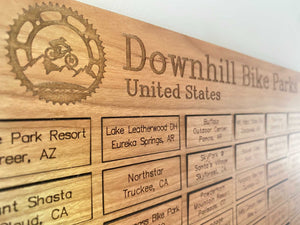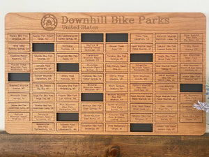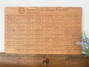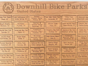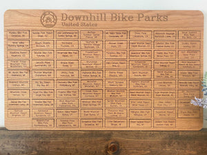 This Mountain Biking Bucket List Board features all 78 of the Downhill Bike Parks in the United States. So if you’ve been looking for the perfect gift for the mountain biker in your life, look no more! The board can be used by any mountain biking enthusiast to track which of the bike parks in the US they’ve visited. It gives you an easy, yet classy, way to track your bike park visits, then to proudly display your progress in your home, garage, man cave, or office. And, most importantly, it serves as a visual reminder to go out there and live your dreams. Whether it’s for you or a bike gift for a loved one, it’s the ultimate mountain biker’s bucket list!