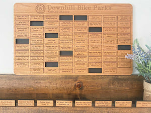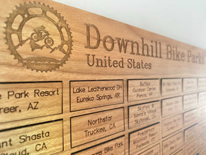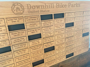This Mountain Biking Bucket List Board features all 78 of the Downhill Bike Parks in the United States. So if you’ve been looking for the perfect gift for the mountain biker in your life, look no more! The board can be used by any mountain biking enthusiast to track which of the bike parks in the US they’ve visited. It gives you an easy, yet classy, way to track your bike park visits, then to proudly display your progress in your home, garage, man cave, or office. And, most importantly, it serves as a visual reminder to go out there and live your dreams. Whether it’s for you or a bike gift for a loved one, it’s the ultimate mountain biker’s bucket list!