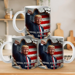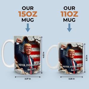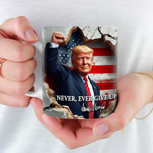 Show your unwavering support for Trump and the 2024 campaign with the Never Ever Give Up Trump2024 Mug! Featuring an inspiring and motivational message, this mug is perfect for those who stand firm in their beliefs and are ready to keep fighting for change. Whether you're enjoying your morning coffee, tea, or simply want to make a statement at the office, this mug will serve as a daily reminder of your commitment to the cause.