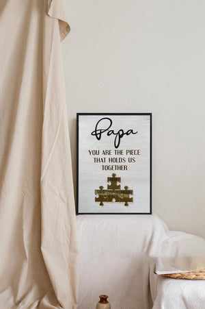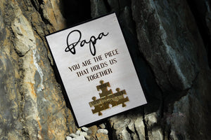 Crafted with care and attention to detail, this wooden sign features the endearing message "PAPA You Are The Piece That Holds Us Together." It's a daily reminder of the love and appreciation your family has for Dad's unwavering support and guidance.