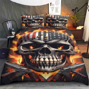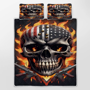 Patriot Skull American Flag Print Quilt Bed Set, Skull Bedding Set, US 250th Anniversary Quilt Sets