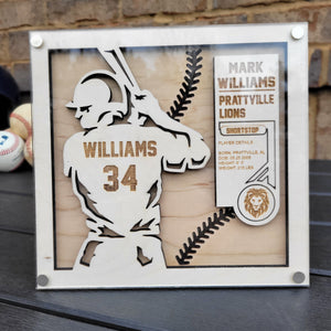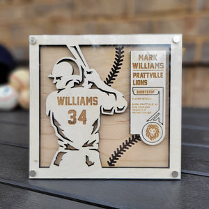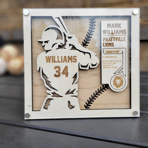 Make it truly special by customizing the plaque with the player's name, team name, position, year, place of birth, date of birth, height, weight, and jersey number for a unique touch. Optionally, player stats such as home runs, state championships, graduation year, and other notable achievements can also be included. Logos, including the team's logo, can be added in the circle on the bottom right-hand side of the plaque.