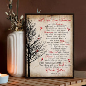 Design: The print showcases a serene background with a vibrant cardinal perched gracefully, surrounded by soft, muted colors. The heartfelt poem, "As I Sit In Heaven," is elegantly displayed, adding a poignant message of love and remembrance.