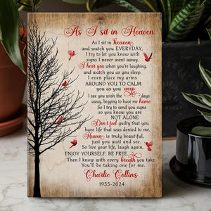 Honor the memory of a loved one with our heartfelt "As I Sit In Heaven" Memorial Canvas Print. This touching piece features a beautiful cardinal design, symbolizing the presence of those we have lost. Perfect for Christmas or any time of year, it serves as a comforting reminder that our loved ones are always with us.