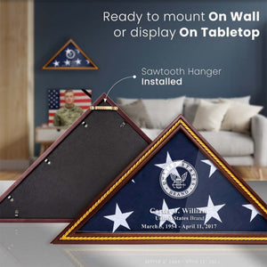 The sturdy base of the commemorative flag case allows it to be placed on any flat surface such as a mantel or display case. Alternatively, it can be hung from standard hardware using the adjustable hanger securely placed on the reverse side. The dimensions of the case are 13.00 x 24.5 x 3.25, and it is designed to fit a Military flag size of 5x9 or 5x9.5.