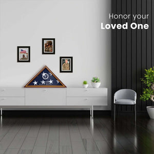 This flag case is perfect for displaying alongside other military honors and medals, providing a complete story of a life of service. It also complements family photos, keepsakes, and mementos of any variety, making it a versatile and meaningful addition to any home.