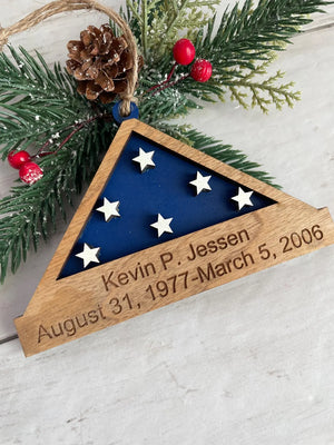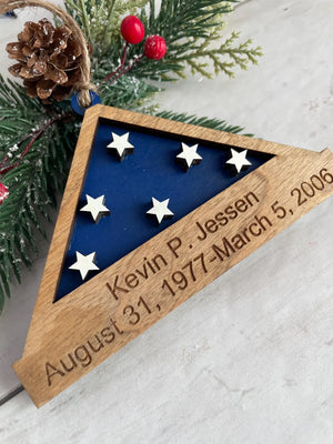 - Engraved Military Design: Featuring a symbolic folded flag, military emblem, or other personalized design, this ornament honors the veteran’s service. The engraved details are carefully etched into the wood, creating a lasting and elegant tribute.