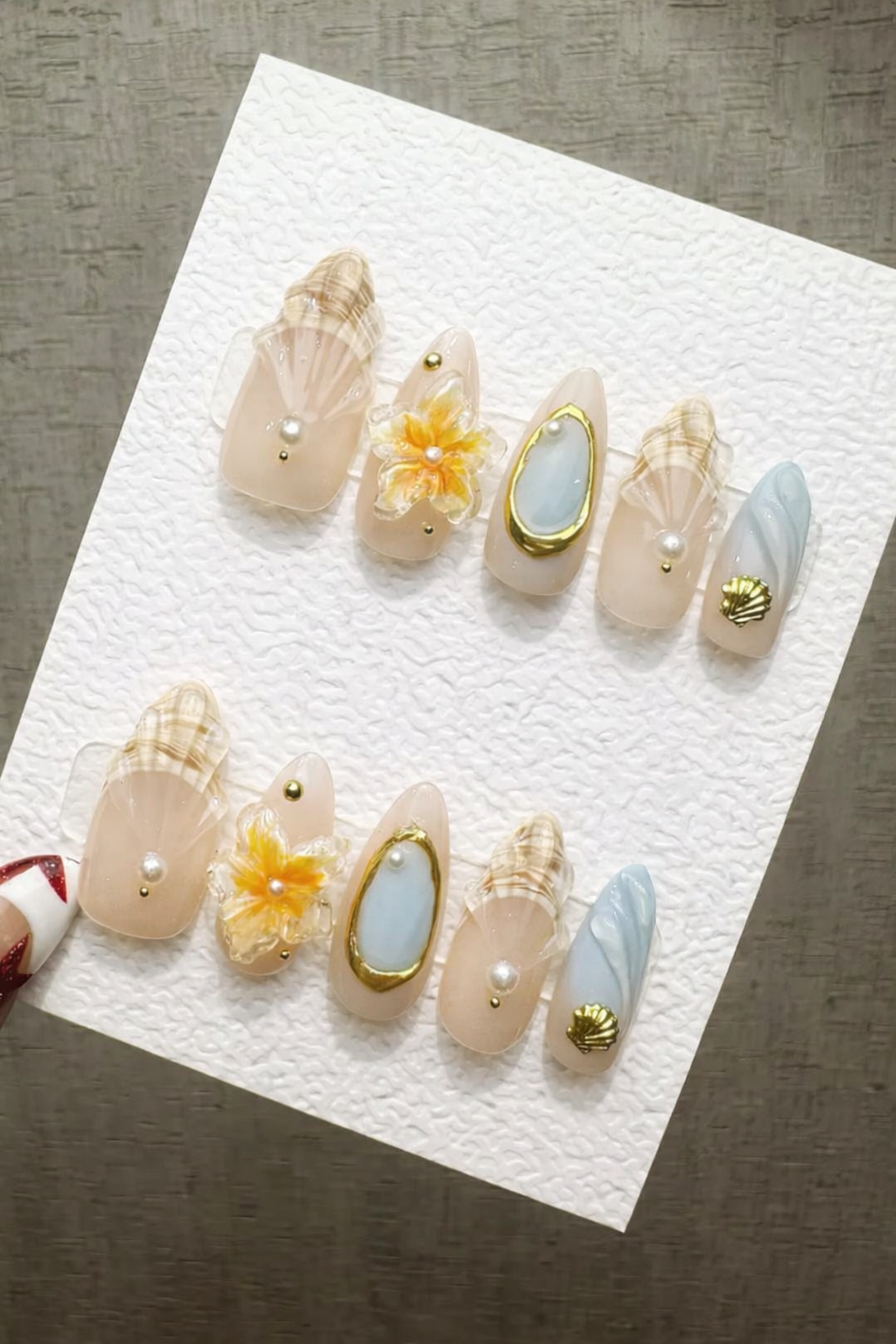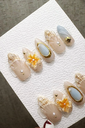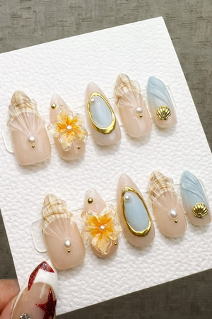 Reusable Coastal Chic, Handmade Press On Gel, Pearl Seashell Summer Press On Nails
